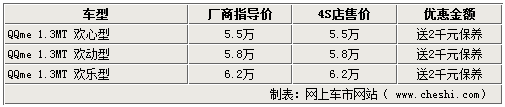 奇瑞在推出QQ家族的新成員QQme后,令經(jīng)典的QQ全系車型再度引起消費者的關注。近日網(wǎng)上車市車市網(wǎng)站由經(jīng)銷商處了解到,新上市不久的QQme雖然沒有現(xiàn)金優(yōu)惠,但是贈送價值2000元的保養(yǎng)卡。