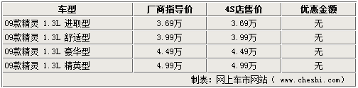 作為長城汽車的首款轎車產(chǎn)品,精靈在前段時(shí)間再次推出了09款新車型,在上市的同時(shí)進(jìn)行了價(jià)格調(diào)整,精英型、豪華型、舒適型三個(gè)品種基于老款降幅4000元。目前長城精靈的老款車型的現(xiàn)車已經(jīng)不多。