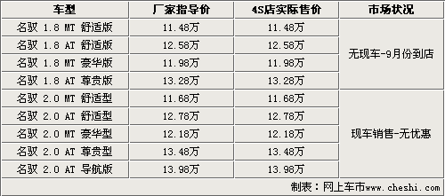 據(jù)北京地區(qū)現(xiàn)代4S店銷售人員表示,現(xiàn)在各4S店內(nèi)均有MOINCA名馭2.0L現(xiàn)車銷售,由于是剛剛上市的新車,所以在價(jià)格方面沒有任何優(yōu)惠。至于1.8L車型,銷售人員則表示,1.8L車型要到9月份才能到店,目前接受現(xiàn)金預(yù)定。銷售人員還表示,1.8L的MOINCA名馭將主要面對(duì)出租車市場(chǎng),所以客戶需要等待較長(zhǎng)一段時(shí)間。