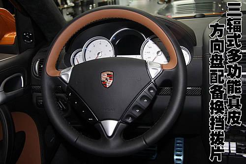保時捷卡宴Turbo S三輻式多功能方向盤采用真皮材質(zhì),手感舒適且做工考究。通過方向盤上的換擋撥片可實(shí)現(xiàn)類似跑車的手動換擋,突顯駕駛樂趣。而集中在方向盤左右的快捷按鈕觸手可及,方便日常使用。