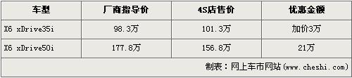 據(jù)北京寶馬經(jīng)銷(xiāo)店銷(xiāo)售人員介紹,現(xiàn)在在售的X6車(chē)型分為售98.3萬(wàn)元的35i車(chē)型和售價(jià)為177.8萬(wàn)元的50i兩款車(chē)型。店內(nèi)沒(méi)有35i車(chē)型的現(xiàn)車(chē),消費(fèi)者需要交訂金10萬(wàn)元,待店內(nèi)到車(chē)后提現(xiàn)車(chē)還要加價(jià)3萬(wàn)元,售價(jià)從98.3萬(wàn)元上升到了100.3萬(wàn)元,排量更大的4.4升的50i車(chē)型有21萬(wàn)元的現(xiàn)金優(yōu)惠,售價(jià)降到了156.8萬(wàn)元。銷(xiāo)售人員還介紹,50i車(chē)型現(xiàn)車(chē)店內(nèi)也不多,欲購(gòu)買(mǎi)的消費(fèi)者需加快購(gòu)買(mǎi)腳步。