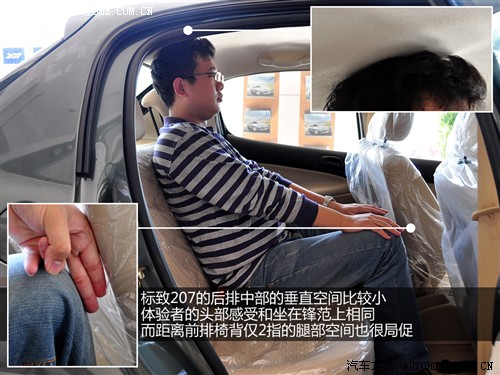 坐在標(biāo)致207后排兩邊的正常座位上,體驗(yàn)者頭部距離車頂僅兩指,這不太符合基本舒適性的要求,但也可以忍受。而腿部空間的表現(xiàn)可以被接受,頭枕的可調(diào)高度很符合安全性及舒適性的綜合標(biāo)準(zhǔn)。