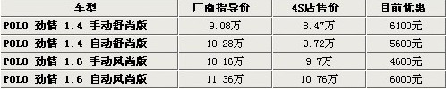 據(jù)4S店銷售人員介紹:目前POLO勁情全系僅為4款車型。之前的1.4升手動擋兩款車型合并為1.4手動舒尚版,1.4升自動擋兩款車同樣合為1.4自動舒尚版。其余1.6升兩款車型不變。目前全系最高優(yōu)惠6100元,其余三款車優(yōu)惠幅度都有所不同。目前全系現(xiàn)車非常少,預(yù)定需等1個月時間,如預(yù)定黑色和白色需等2個月以上,建議購買銀色、紅色、藍(lán)色車款。