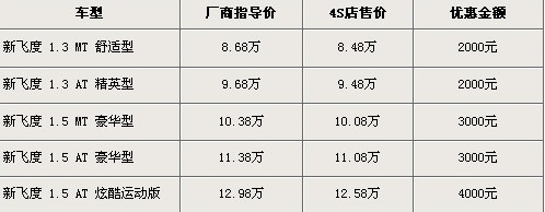 據(jù)廣州本田北京地區(qū)4S店銷售人員介紹,新飛度在售車型分為1.3L及1.5L共5個車型在售,最低售價8.48萬元,全系車型優(yōu)惠金額2千-4千不等。目前新飛度銷售火爆,部分車型及顏色需要預定。北京地區(qū)各4S店由于訂單不同,各店銷售的現(xiàn)車顏色有所不同。