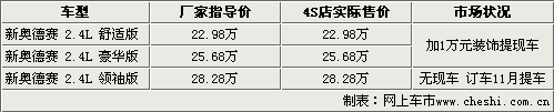 據(jù)北京地區(qū)廣州本田4S店銷售人員介紹,新款奧德賽在上市之前訂單數(shù)量已經(jīng)非;鸨,上市之初各經(jīng)銷商只有展車和試駕車。目前訂單數(shù)量仍在增加,只有部分4S店有部分現(xiàn)車銷售,消費(fèi)者要提現(xiàn)車的話則必須要加裝1萬元的裝飾。如果訂車的話需要繳納5000元-1萬左右訂金,11月初才能提到車。