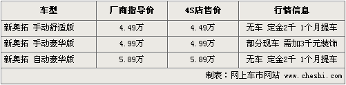 據(jù)長安鈴木北京地區(qū)4S店銷售人員介紹,目前新奧拓銷售火爆,只有手動豪華版有現(xiàn)車,以藍(lán)色、白色、金色為主,提車需要在4S店加裝3000元裝飾。其余車型及顏色需要預(yù)訂,定金為2000元,最快1個月可提車。北京地區(qū)各4S店由于訂單不同,各店銷售的現(xiàn)車顏色有所不同。
