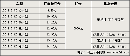 據(jù)北京現(xiàn)代北京地區(qū)4S店銷售人員介紹,現(xiàn)代i30因上市不久,新車貨源比較緊張,但現(xiàn)在已有少量1.6及2.0頂配車型現(xiàn)車到店,顏色以紅色、銀色為主。其余車型預(yù)訂最快半個(gè)月可提車,訂金為5000元。北京地區(qū)各4S店由于訂單不同,各店銷售的現(xiàn)車顏色有所不同。