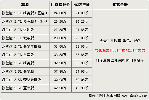 據(jù)北京地區(qū)廣州豐田4S店銷(xiāo)售人員介紹,目前漢蘭達(dá)除2.7豪華及頂配車(chē)型有位數(shù)不多的現(xiàn)車(chē)外,其他款均需要預(yù)訂,但正常訂車(chē)的話需要等到年底或明年1月份提車(chē)。消費(fèi)者如果提現(xiàn)車(chē)的話,需要加現(xiàn)金1.5萬(wàn)元現(xiàn)金或者加裝2.5萬(wàn)元裝飾,現(xiàn)車(chē)顏色有黑色、銀色可供選擇。北京地區(qū)各4S店由于訂單不同,各店銷(xiāo)售的現(xiàn)車(chē)顏色有所不同。