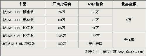 據(jù)經(jīng)銷商銷售人員介紹,途銳的旗艦車型W12缸的6.0L頂配型已經(jīng)停止進口。而3.6L的車型有5萬元的優(yōu)惠,最低配的3.6L標(biāo)準(zhǔn)型的售價從74萬元下跌到了69萬元,首次跌破了70萬元。4.2L頂級版由于店內(nèi)沒有現(xiàn)車所以沒有優(yōu)惠,欲購買的消費者需交訂金10萬元,約等2個月才可提車。