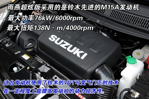 售價(jià)達(dá)到9.88萬元的1.5炫酷版AT在強(qiáng)調(diào)性價(jià)比的雨燕全系中是頂配車型,因此勢必要配備一些豪華型配置。諸如全車六安全氣囊、多功能方向盤以及自動空調(diào)都是小型車中少有的。而此車型搭載的1.5L發(fā)動機(jī)更是值得推薦。這臺M15A發(fā)動機(jī)是雨燕上市一段時(shí)間后才追加的動力單元,目的就是提高雨燕的動力表現(xiàn)。1.5L發(fā)動機(jī)采用了全鋁材質(zhì)重量更輕,同時(shí)配有VVT可變氣門正時(shí)系統(tǒng),在燃油經(jīng)濟(jì)性方面也得到了提升。