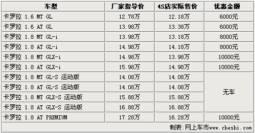 據(jù)一汽豐田4S店銷售人員介紹:目前2.0L排量的運(yùn)動(dòng)版車型無現(xiàn)車銷售,購買其他車型則可以享受到8000元——10000元的現(xiàn)金優(yōu)惠。入門級(jí)的1.6 MT GL版車型售價(jià)降到了12.18萬元,高配的1.8 AT PREMIUM版經(jīng)10000元優(yōu)惠后,售價(jià)也降到了16.28萬元。