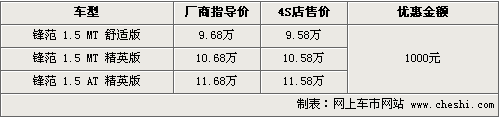 據(jù)4S店銷售人員介紹,目前鋒范1.5排量有現(xiàn)車供應(yīng),主要顏色有銀色/紅色/灰色等外觀,車價方面優(yōu)惠并不多,只有1000元。部分款顏色還需要預(yù)訂。