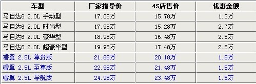 據(jù)北京地區(qū)一汽馬自達4S店銷售人員介紹,目前購買睿翼或馬自達6均有較大的優(yōu)惠幅度。睿翼車型全系優(yōu)惠現(xiàn)金1.5萬元,且現(xiàn)車顏色齊全,同時老款車型最高讓利2.7萬元,車價最低僅為15.28萬元。并且購買新老車型均有裝飾贈送,新老款車型消費者可以根據(jù)需求選購。北京地區(qū)各4S店由于訂單不同,各店銷售的現(xiàn)車顏色有所不同。