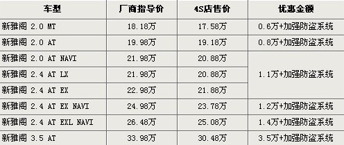 據(jù)廣州本田北京地區(qū)4S店銷(xiāo)售人員介紹,現(xiàn)購(gòu)買(mǎi)新雅閣均有6千-3.5萬(wàn)不等的優(yōu)惠,最低售價(jià)17.58萬(wàn),另贈(zèng)送“車(chē)行無(wú)憂”加強(qiáng)防盜系統(tǒng),例如您的車(chē)被拖走也會(huì)第一時(shí)間知道。3.5AT頂級(jí)型目前現(xiàn)車(chē)較少,則需要預(yù)定。