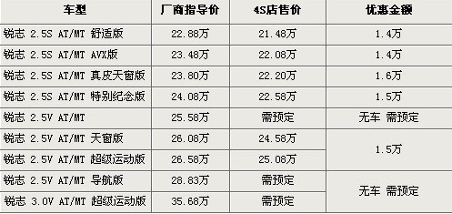 目前銳志全系車型最高優(yōu)惠可到1.6萬元。目前優(yōu)惠后的最低售價(jià)僅為21.48萬元,其中現(xiàn)車主要是2.5S版車型,2.5V部分車型需要預(yù)訂,訂金需要交納5000元。最快11月才能提車。