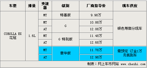 花冠EX系列兩款豪華版車型在增加了天窗的基礎(chǔ)上,還配置了真皮座椅、前閱讀燈等實(shí)用配置。價(jià)格放買你相比較G特別版漲了3000元。新增加的4款車型均為1.6小排量車型,消費(fèi)者在購(gòu)車同時(shí)可以享受購(gòu)置稅優(yōu)惠活動(dòng),目前尚沒(méi)有現(xiàn)車到店,消費(fèi)者購(gòu)車的話需要交訂金1萬(wàn)元,預(yù)計(jì)月底可以到車。