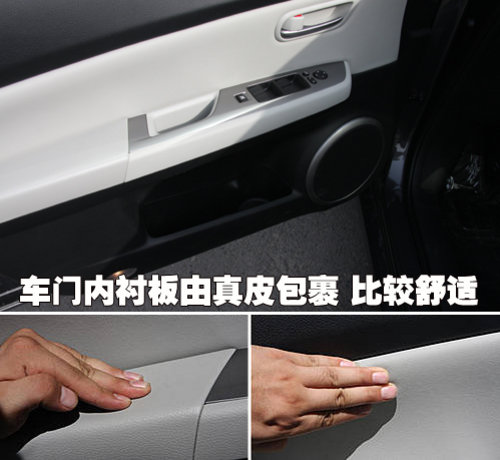 車門內(nèi)襯板由真皮包覆,材質(zhì)比較柔軟,駕車時或長途駕駛,喜歡把胳膊放在車門邊的朋友都會感到比較舒適。