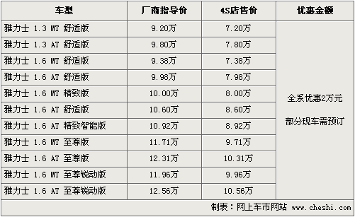據(jù)廣汽豐田北京地區(qū)4S店銷售人員介紹,現(xiàn)在購買雅力士車型全系優(yōu)惠現(xiàn)金2萬元。目前雅力士1.3車型和1.6舒適、精致均有現(xiàn)車供應,至尊及銳動版現(xiàn)車數(shù)量較少,部分車型需預訂,F(xiàn)車顏色以黑色、紫色、銀色為主。如消費者有意購買,到店詳談會有更優(yōu)惠的價格。北京地區(qū)各4S店由于訂單不同,各店銷售的現(xiàn)車顏色有所不同。