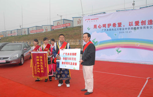 中新網(wǎng)10月29日電 日前,“用心呵護(hù)希望,以愛創(chuàng)造明天——廣汽本田向北川職業(yè)中學(xué)捐贈(zèng)教學(xué)用車儀式”在北川職業(yè)中學(xué)綿陽(yáng)九洲板房校區(qū)舉行。廣汽本田汽車有限公司向北川職業(yè)中學(xué)捐贈(zèng)了一批價(jià)值100萬(wàn)元的教學(xué)用車及設(shè)備,用于該校汽車修理專業(yè)的教學(xué),為災(zāi)區(qū)學(xué)校恢復(fù)正常教學(xué)提供幫助。在捐贈(zèng)儀式結(jié)束后,來(lái)自廣汽本田的講師還為汽修專業(yè)的同學(xué)們上了一堂生動(dòng)的汽車專業(yè)課。
