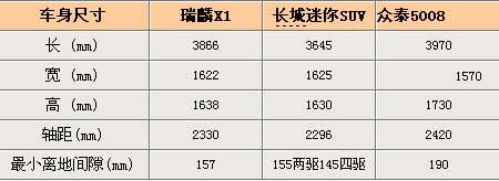 瑞麒X1定位于奇瑞首款微型SUV產(chǎn)品,長(zhǎng)寬高分別達(dá)到3866×1622×1638mm,軸距也達(dá)到了2330mm。體積在三車中低于眾泰5008,但高于長(zhǎng)城迷你SUV。