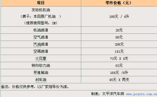 廣汽本田為雅閣提供3年或十萬公里的質保期限,首保是在5000公里,以后每過5000公里保養(yǎng)一次。與大多數日系車型相同,廣汽本田對雅閣車型機油機濾更換周期的官方建議是5000公里,廣汽本田4S店一般建議車主使用級別較高的SM級本田原裝機油。每次常規(guī)保養(yǎng)用料費用為217元,加上200元的更換機油機濾工時費一共是417元。在4萬公里內進行常規(guī)保養(yǎng)總共6次。到了2萬公里的時候,車主要在常規(guī)保養(yǎng)基礎上增加空氣濾清與空調濾清的保養(yǎng),保養(yǎng)費用也相應的增加,需要707元。而到了4萬公里的時候要進行一次大保養(yǎng),需要更換機油機濾、空氣濾清、空調濾清、汽油濾清、火花塞與變速箱油,而保養(yǎng)費用也需要過千元,達到1611元。