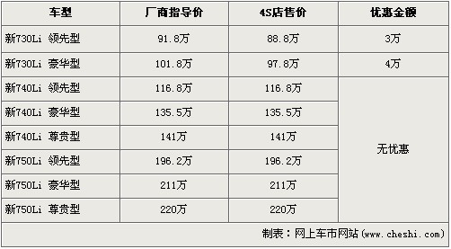 據(jù)北京寶馬經(jīng)銷店銷售人員介紹,寶馬新7系共分為730Li、740Li、750Li三種等級車型,售價區(qū)間為91.8萬元-220萬元。目前購買新730Li領先型的消費者可以得到3萬元的優(yōu)惠,新730Li豪華版車型可以優(yōu)惠4萬元。消費者還介紹,除了新730Li有現(xiàn)車外,其余車型均需預訂,訂金是10萬元,最早12月份可提車。