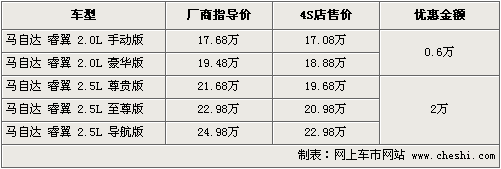 據(jù)一汽馬自達(dá)4S店銷售人員介紹,目前睿翼2.0L車型開始有小幅優(yōu)惠,現(xiàn)金優(yōu)惠6千元或購車送導(dǎo)航,而2.5L車型全系優(yōu)惠達(dá)到了2萬元,現(xiàn)車顏色以黑色、銀色為主。另外2.5L尊貴版優(yōu)惠后售價(jià)為19.68萬元,只和2.0L豪華版相差8千元,值得消費(fèi)者考慮一下。睿翼部分顏色還需預(yù)訂,訂金只需500元,最快1周就可以提到車。如消費(fèi)者有意購買,到店詳談會(huì)有更優(yōu)惠的價(jià)格。北京地區(qū)各4S店由于訂單不同,各店銷售的現(xiàn)車顏色有所不同。