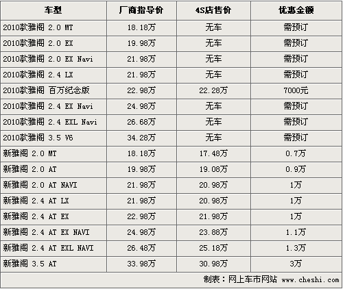 據(jù)4S店銷售人員介紹,目前部分2010款百萬紀念版雅閣新車已經(jīng)到店,消費者購車的話可以優(yōu)惠7000元。其他款車型還需要預(yù)訂,訂金為2000元,F(xiàn)在店內(nèi)08款車型最高可優(yōu)惠現(xiàn)金3萬元,入門級車型優(yōu)惠現(xiàn)金7000元,以2.0手動檔為例,優(yōu)惠后僅首17.49萬。現(xiàn)在店內(nèi)有黑色、銀色等可供消費者選擇。