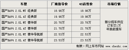 據(jù)一汽豐田北京地區(qū)4S店銷售人員介紹,目前該車有部分車型少量現(xiàn)車,由于RAV4貨源比較緊張,大部分車型及顏色消需要提前預(yù)定,訂車需要等待2個月的時間,也就是要到年底前才可以提到現(xiàn)車。如果著急購買,需加價現(xiàn)金一萬元或在4S店購買等值的裝飾,F(xiàn)車顏色以黑色、白色、銀色為主。北京地區(qū)各4S店由于訂單不同,各店銷售的現(xiàn)車顏色有所不同。