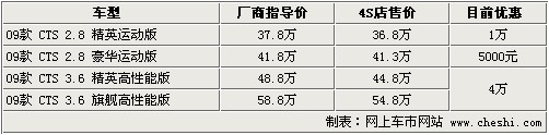 據(jù)4S店銷售人員介紹:目前在售的凱迪拉克09款CTS共有2.8L和3.6L兩個排量車型。這4款車型中,3.6升車型優(yōu)惠幅度較大,2款車可優(yōu)惠4萬元;而2.8升車型優(yōu)惠較少,豪華運動版僅優(yōu)惠5000元。目前3.6升車型為數(shù)不多,喜歡的朋友請盡快與店內聯(lián)系。顏色方面,2.8升精英運動版車型有白色、銀色、金色,2.8升豪華運動版有紅色車型,3.6升車型有紅色、灰色車型。另外,年底或明年初將上市新款凱迪拉克CTS,并配備3.0升直噴發(fā)動機,對此車感興趣的朋友請隨時關注。