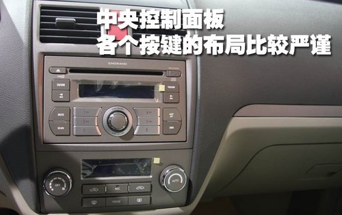 帝豪EC718-RV的中央控制面板的整體做工與以往車型相比,都有很大提升。從圖中可以看到,這款車配備了DVD音響、大尺寸液晶顯示屏和自動恒溫空調(diào),舒適性、功能性配置都非常齊全。