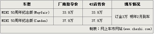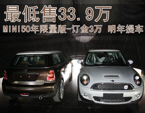 據(jù)北京經(jīng)銷店銷售人員介紹,MINI50周年分為Mayfair和Camden兩款車型,售價(jià)分別我餓哦33.9萬元和37.9萬元。目前店內(nèi)已經(jīng)可以接受MINI50周年紀(jì)念版車型的預(yù)訂,訂金為3萬元,最早一批現(xiàn)車將會(huì)在明年的2月份交到消費(fèi)者的手里。
