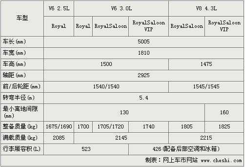從配置表中可以看出,新一代皇冠共分2.5L,3.0L和4.3L三個(gè)排量共六款車(chē)型,預(yù)計(jì)還將有導(dǎo)航版等車(chē)型推出,車(chē)型總數(shù)將超過(guò)6款。相比現(xiàn)款車(chē)型,全新一代皇冠車(chē)身尺寸全面增加。車(chē)身長(zhǎng)度達(dá)到5005mm,寬度1810mm,2.5和3.0排量車(chē)身高1500mm,4.3排量車(chē)身高1475mm,而軸距更達(dá)到了2925mm,比現(xiàn)款長(zhǎng)出75mm。在裝備質(zhì)量上空載情況下比現(xiàn)款增加60-140kg ,滿(mǎn)載情況下增加80-145kg。