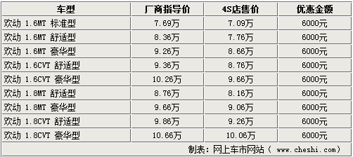 銷售人員表示,現(xiàn)在店內(nèi)的歡動(dòng)車型較齊全,全系車型均可享受6000元的現(xiàn)金優(yōu)惠,同時(shí)還有1000元至2000元的大禮包贈(zèng)送,同樣超值,但不可折換現(xiàn)金。