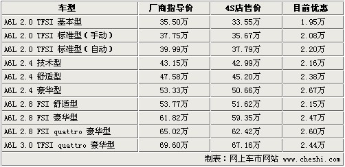 據(jù)奧迪4S店銷售人員介紹:目前2010款奧迪A6L車系部分車型有現(xiàn)車,2.0T與2.4升車型有部分黑色現(xiàn)車,顏色不是特別齊全,預(yù)訂需等10天左右,每款車型具體情況有所不同。2.8升排量車型目前現(xiàn)車較少,只有個別款有現(xiàn)車,顏色為黑色,如需預(yù)定需等1個月以上。優(yōu)惠方面,奧迪A6L全系最高優(yōu)惠2.67萬元,相比之前有所提高。