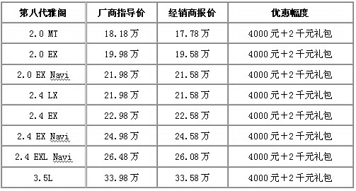 新雅閣,自誕生之日起就打著“史上最強(qiáng)雅閣”的旗號(hào),10月更是一舉奪得昆明中級(jí)車上牌量亞軍,其實(shí)力不容小覷。近日,車天下編輯從廣本梁源店獲悉,自2009年12月14日至12月31日購置雅閣車型即可享受4000元?dú)q末現(xiàn)金優(yōu)惠以及2000元店慶購車禮包。具體車型及詳細(xì)優(yōu)惠政策,如下表: