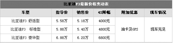 筆者從滬上經(jīng)銷商處了解到,比亞迪F3豪華版最高優(yōu)惠6800元,而舒適型和標(biāo)準(zhǔn)型各優(yōu)惠4000元和4800元。目前現(xiàn)車充足,到店即可提車,感興趣的朋友不妨到店詳談,可以爭取到更多的讓利。