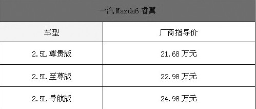 2009年4月12日,一汽馬自達(dá)宣布Mazda6睿翼正式上市。初期上市的Mazda6睿翼只有2.5L排量的三款車型可以選擇,售價在21.68-24.98萬元,即日起全國140家一汽馬自達(dá)4S店就可以接受預(yù)訂,首批新車將于4月25日到達(dá)展廳。