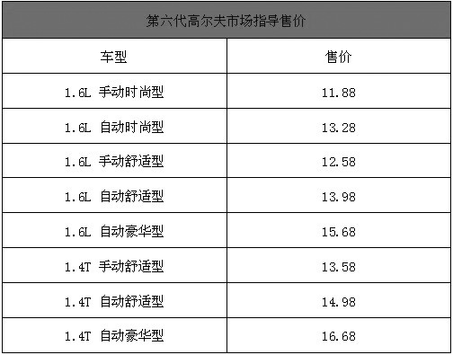 2009年10月19日,結(jié)束了歐亞大陸的長途跨越,完成了對完美城市的探尋與交融,人們期待已久的第六代高爾夫終于在長春正式宣布上市。第六代高爾夫共推出了1.6L和1.4TSI兩種排量、八款車型供消費者選擇,兩種排量的發(fā)動機都可匹配7速DSG雙離合自動變速箱和5擋手動變速箱,售價11.88萬-16.68萬元,具體售價如下表:第六代高爾夫市場指導(dǎo)售價