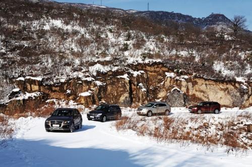 然后需要集中說明的是它們在雪地中的表現(xiàn)。我們曾在一條被積雪完全覆蓋的道路上駕駛了好一會兒,經(jīng)過反復的比較,我發(fā)覺XC60和SRX的表現(xiàn)幾乎相差無幾,兩輛車在抓地力方面不存在什么明顯的問題,最多只是在起步和停車時會發(fā)生一些打滑,它們最主要的問題是方向盤在這種情況下會完全喪失路感,這讓人在駕駛時不免感到戰(zhàn)戰(zhàn)兢兢。Q5的情況要比前面提到的兩臺車稍好一些,但一旦稍微快一些就會讓人產(chǎn)生信心不足的感覺,在同樣的條件下quattro發(fā)生打滑的次數(shù)明顯較SRX和XC60來得少。GLK無疑是在這種路面上表現(xiàn)最杰出的車型,在普通道路上略顯閑散的方向盤在這種路面上卻能得到充分的信息反饋,而且GLK是唯一在這種路面能讓人放心給油快速前行的車輛,所以GLK無疑是在低牽引力條件的路面上表現(xiàn)最好的車型。