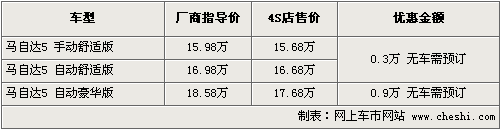 據(jù)一汽馬自達北京地區(qū)4S店銷售人員介紹:馬自達5的現(xiàn)車供應持續(xù)比較緊張,現(xiàn)購買頂配車型最高優(yōu)惠現(xiàn)金9千元,低配車型優(yōu)惠3千元。店內(nèi)目前沒有現(xiàn)車供應,需要預訂,訂金為1萬元,最快等待15天左右可以提車。如消費者有意購買,到店詳談會有更優(yōu)惠的價格。北京地區(qū)各4S店由于訂單不同,各店銷售的現(xiàn)車顏色有所不同。