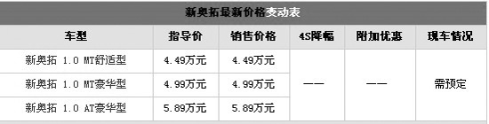 目前新奧拓有3款車型在售,其中手動舒適型標配ABS/EBD和前排雙安全氣囊安全裝置,同時配置后霧燈以及前門電動車窗等配置;手動豪華版在舒適型的基礎(chǔ)上增加了遙控鑰匙、鋁合金輪轂、真皮座椅、單碟CD、前霧燈以及后門車窗電動調(diào)節(jié)等人性化配置;而自動豪華版和手動豪華版的配置相同。