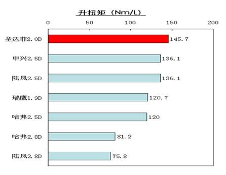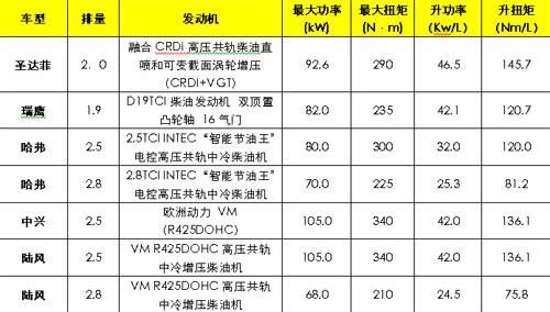通過發(fā)動(dòng)機(jī)的對(duì)比(上表),我們不難發(fā)現(xiàn),在發(fā)動(dòng)機(jī)的功率和扭矩方面中興和陸風(fēng)略勝一籌,然而在真正反映發(fā)動(dòng)機(jī)動(dòng)力技術(shù)水平的指標(biāo)——升功率上,排量較小的圣達(dá)菲2.0T則領(lǐng)先排名第二的瑞鷹10.5。