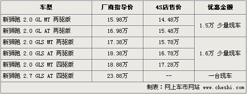 據(jù)東風悅達起亞4S店銷售人員介紹,目前獅跑2.0車型高配車型優(yōu)惠1.6萬元,低配車型優(yōu)惠1.5萬元,其中2.0兩驅(qū)最低售價14.28萬元,目前自動檔現(xiàn)車不太齊全,部分車型顏色還是需要預訂,訂金為2千元,最快半個月內(nèi)可以提到車。另外如購買2.7車型到店詳談會有更高的優(yōu)惠幅度。另據(jù)介紹,少量的現(xiàn)車中已加入導航、倒車影像系統(tǒng)等配置,價格方面也有所增加。如消費者有意購買,到店詳談會有更優(yōu)惠的價格。北京地區(qū)各4S店由于訂單不同,各店銷售的現(xiàn)車顏色有所不同。