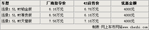 據吉利汽車4S店銷售人員介紹,現在遠景1.5L車型不是很齊全,天窗版沒有現車需要預訂。元旦之前,遠景1.5L車型全系可以優(yōu)惠5000元,但目前這款車型只能優(yōu)惠4000元。不過銷售人員表示,如果到店購車,除了有4000元現金優(yōu)惠以外,還可以贈送全車裝飾。
