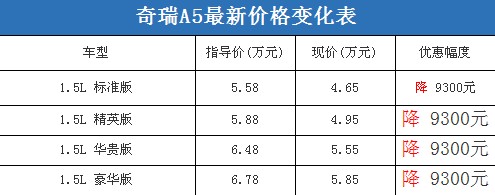 近日,編輯從北京地區(qū)綜合經(jīng)銷商處了解到,奇瑞A5的現(xiàn)車充足,有黑色和灰色現(xiàn)車;目前購(gòu)車的優(yōu)惠幅度接近1萬(wàn)元,最低配的標(biāo)準(zhǔn)版奇瑞A5已經(jīng)僅售4.65萬(wàn)元。據(jù)經(jīng)銷商透露,消費(fèi)者要想以這個(gè)價(jià)格提車,需要在店內(nèi)做一條龍,其中車輛四項(xiàng)基本保險(xiǎn)可以打9折。以下是奇瑞A5最新價(jià)格變化表: