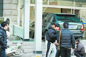 昨天下午4時(shí)許,北三環(huán)安華橋西北角的瑞德大廈門前一片狼藉。一輛原本要停車入位的路虎越野車,撞進(jìn)了大廈門廳左側(cè)的玻璃門。正在門前執(zhí)勤的保安反應(yīng)迅速,才躲開了這只“瘋狂”的“老虎”。