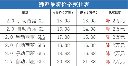 近日,編輯從北京地區(qū)綜合經銷商處了解到,獅跑全系的現(xiàn)車充足,基本上可以滿足消費者在春節(jié)期間的需求;目前購車全系可以優(yōu)惠2萬元現(xiàn)金,性價比很不錯。據經銷商透露,消費者要想以這個價格提車,需要在店內做購車一條龍服務,其中車輛四項基本保險可以打8.5折(約合4500-6300元左右)。以下是獅跑最新價格變化表:
