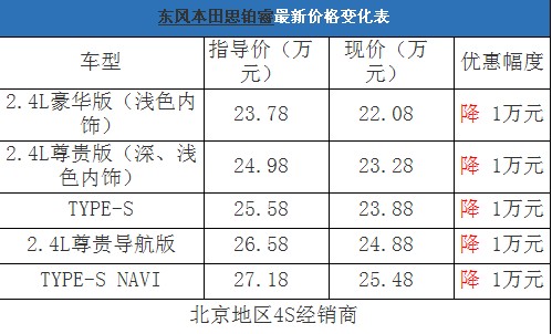 近日,編輯從北京地區(qū)東風(fēng)本田4S經(jīng)銷商處了解到,目前思鉑睿在店內(nèi)有少量現(xiàn)車,購車全系可以優(yōu)惠1萬元現(xiàn)金。以下是思鉑睿最新價(jià)格變化表: