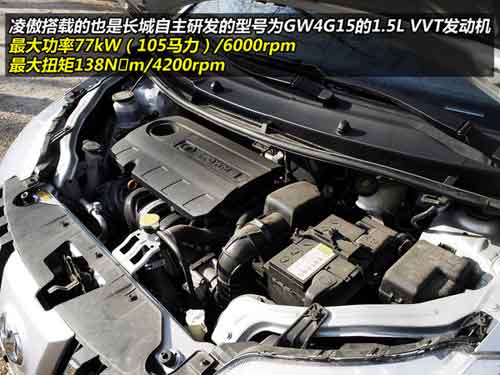 其實,凌傲和酷熊、炫麗一樣,搭載的也是長城自主研發(fā)的型號為GW4G15的1.5L VVT發(fā)動機,最大功率77kW(105馬力)/6000rpm,最大扭矩138N·m/4200rpm,這樣的數(shù)據(jù)在同級別發(fā)動機中屬中上等水平,推動凌傲1.1頓左右的車身完全沒有問題。